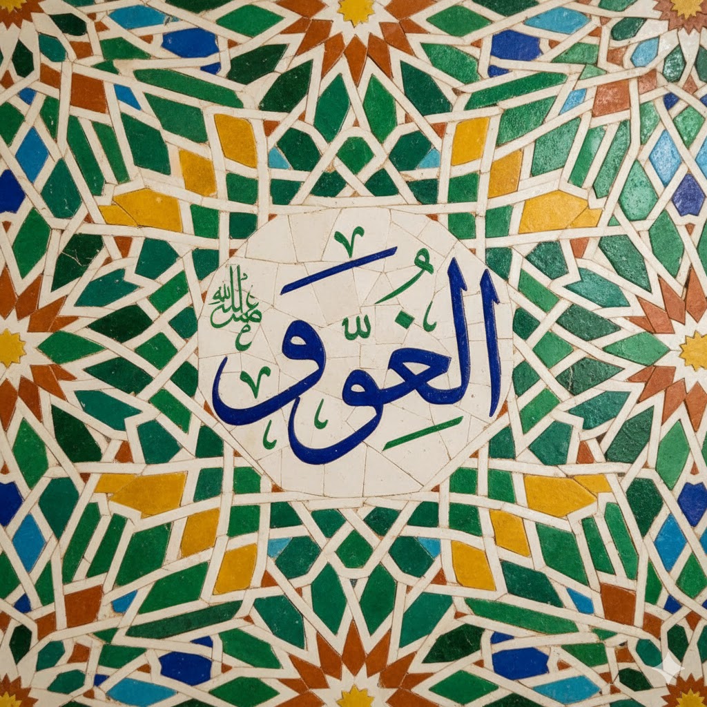 Motif mural calligraphié “الحكمة” (la sagesse) en style maghrébin ou andalou, sur fond de mosaïque colorée.