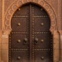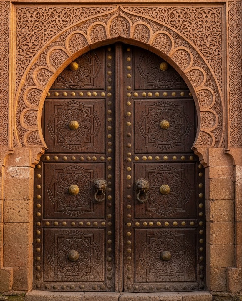 Une grande porte en bois massif ornée de motifs andalous, avec des clous en laiton et des arcs géométriques.